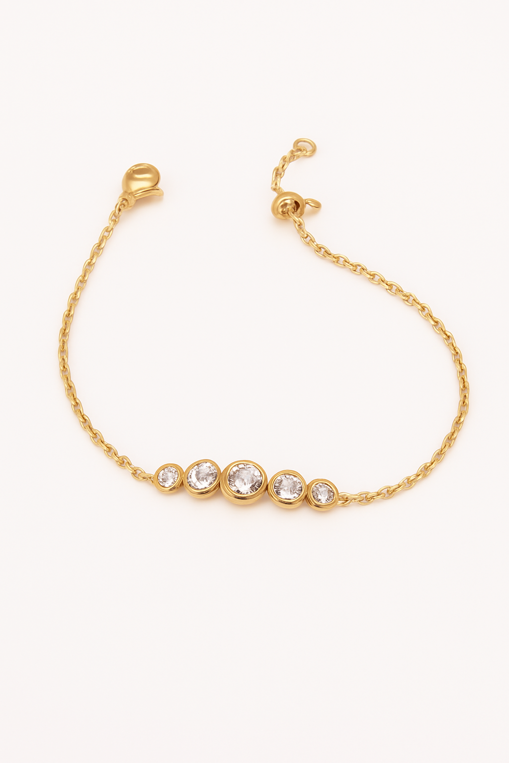 A timeless blend of elegance and strength. This bracelet features five graduated bezel-set stones that catch the light beautifully, linked by a delicate 18ct gold titanium steel chain. Designed to elevate both casual and evening looks, it’s a piece that balances minimalism with subtle luxury. Tarnish-resistant and crafted for everyday wear.