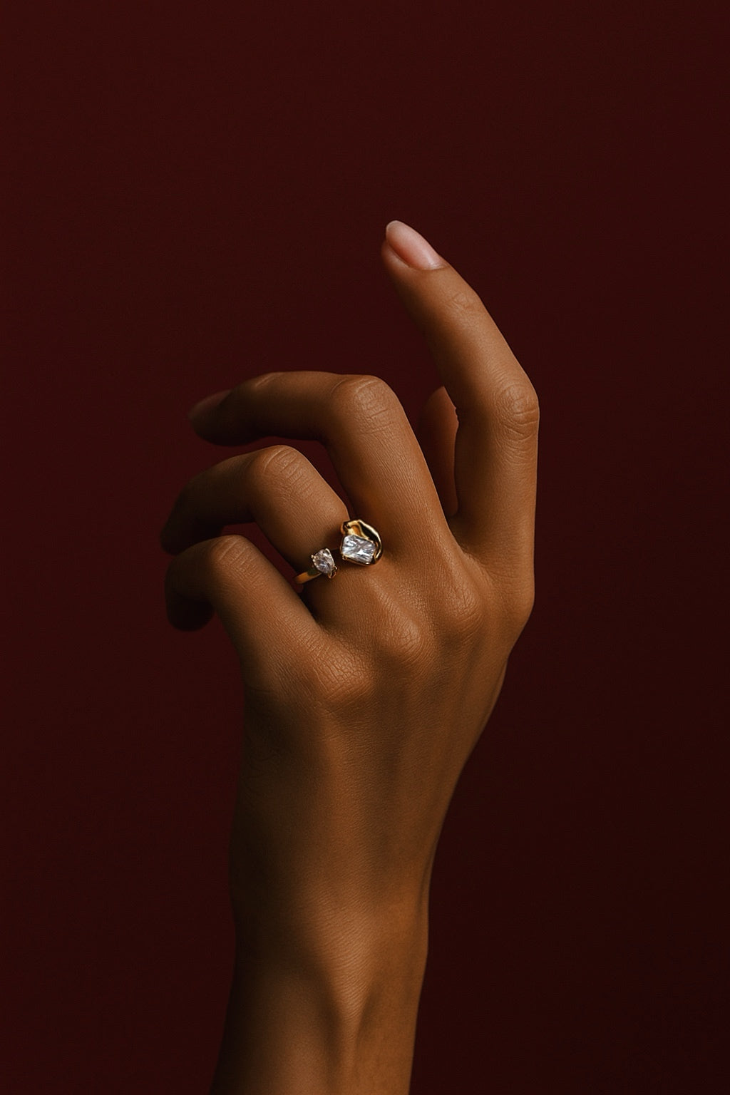 Sculptural and refined, this statement ring features a unique molten design crafted from stainless steel with a high-shine. Two irregularly cut stones sit gracefully atop the organic band, catching the light from every angle. Modern yet timeless, it’s the perfect balance of edge and elegance, ideal for stacking or wearing solo.